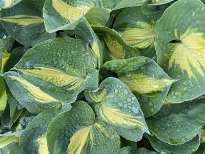 Wide blue-green margins on leaves with a yellow centre. Good vigor. White flowers are carried on 60cm stems.