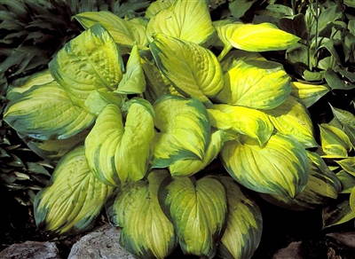 | An improvement on Hosta Guacamole; huge bright shiny golden leaves with dark green margins. Fragrant pale lavender flowers in late summer. Sun tolerant. Hosta of the Year 2006. |