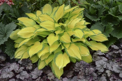 Hosta of the Year 2022! This striking hosta has yellow foliage with a green margin. Dark lavender flowers. PP27151